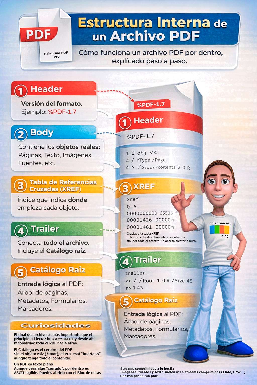 Para localizar rápidamente cada objeto existe la tabla XREF, un índice interno que permite acceder al contenido sin leer todo el archivo. Gracias a esto, los PDF son rápidos incluso siendo grandes.