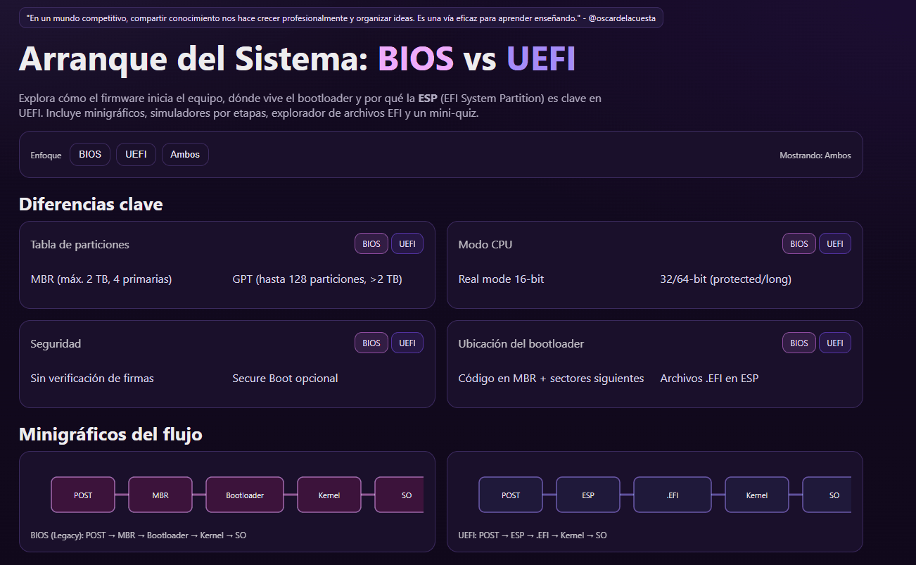 Explora cómo el firmware inicia el equipo, dónde vive el bootloader y por qué la ESP (EFI System Partition) es clave en UEFI. Incluye minigráficos, simuladores por etapas, explorador de archivos EFI y un mini-quiz.