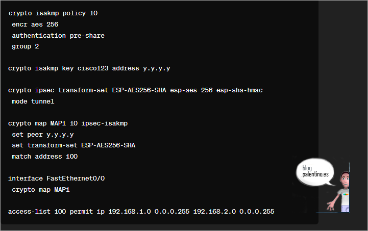 Esta configuración básica debería permitirte establecer una conexión VPN IPsec entre dos redes utilizando routers Cisco. Recuerda ajustar los parámetros de cifrado y autenticación según los requerimientos de tu organización y las capacidades de tu hardware.