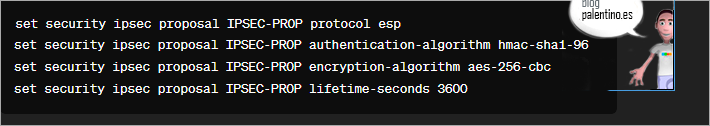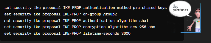 - Configuración en el Router Juniper de la Red A:Primero, configuras la propuesta de IKE (Internet Key Exchange):
