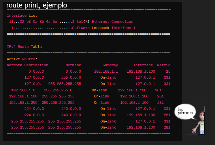 Cuando ejecutas route print en un sistema Windows (o su equivalente en otros sistemas operativos), ves una lista de todas las rutas conocidas por el dispositivo. La tabla de enrutamiento incluye: