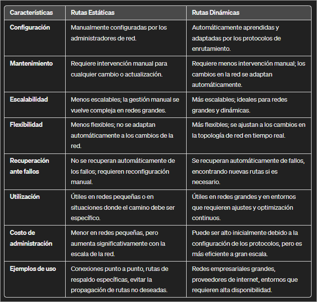 Las rutas dinámicas, por otro lado, son creadas y actualizadas automáticamente por protocolos de enrutamiento como RIP, OSPF o BGP. Estos protocolos permiten que los routers intercambien información entre sí sobre la topología de la red y determinen las mejores rutas posibles para los datos, adaptándose a cambios como la adición de nuevas rutas, la caída de enlaces existentes, o cambios en la topología de la red. La principal ventaja de las rutas dinámicas es que reducen la necesidad de intervención manual y pueden adaptarse rápidamente a los cambios en la red.