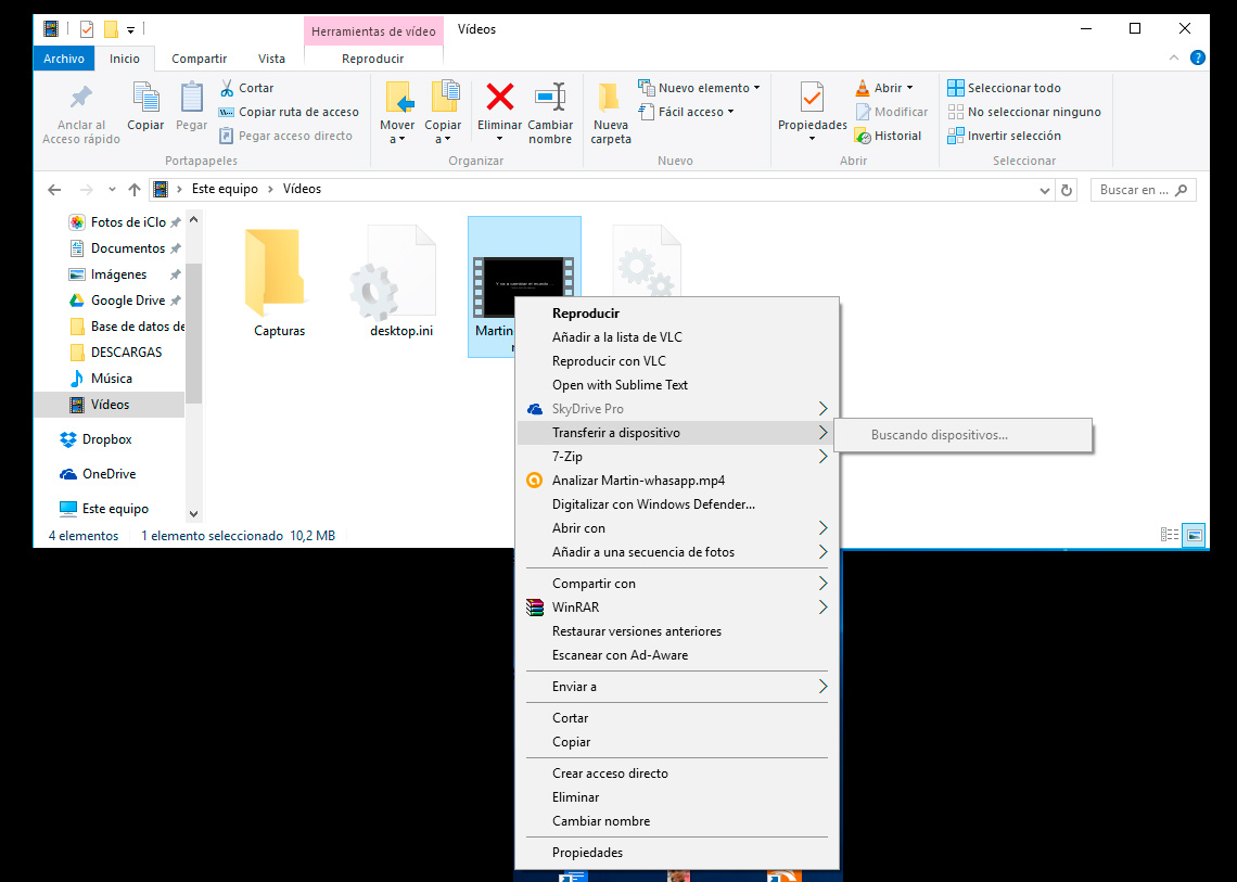 Una vez realizado esto, sobre cualquier vídeo que deseemos ver el la TV, pulsaremos son el Segundo Botón Del Ratón (SBDR) en transferir dispositivo. Tras buscar los dispositivos, encendidos, y seleccionarles, comenzará la reproducción en la TV (ejemplo). Recuerda que puedes controlar la emisión desde el mando del TV.