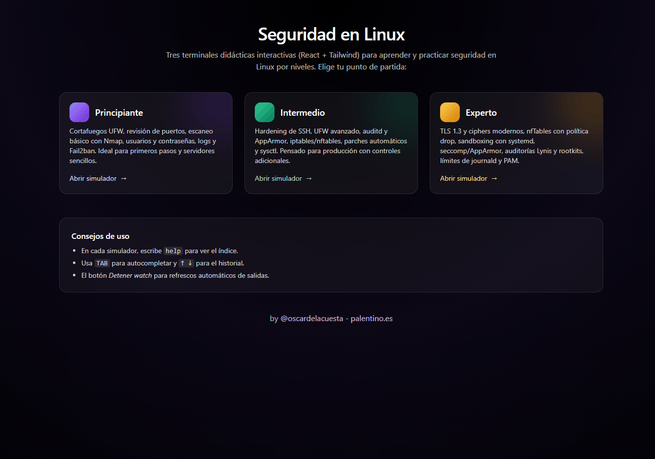 Tres terminales didácticas interactivas (React + Tailwind) para aprender y practicar seguridad en Linux por niveles. Elige tu punto de partida: