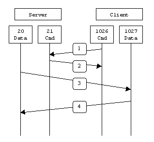 En la conexión activa vemos que el servidor emplea 2 puertos, 20 y 21, y el cliente 2, creados aleatoriamente a partir del 1023 (el 1026) y uno de datos (N+1). El puerto cliente 1027 (N+1) de datos se abre cuando el servidor a través del 20 de datos lo solicita. Para finalmente transmitir del 1027 al 20 los datos. No se si esta explicación es compleja pero es lo que se ocurre en una conexion activa y se puede apreciar en la imagen.