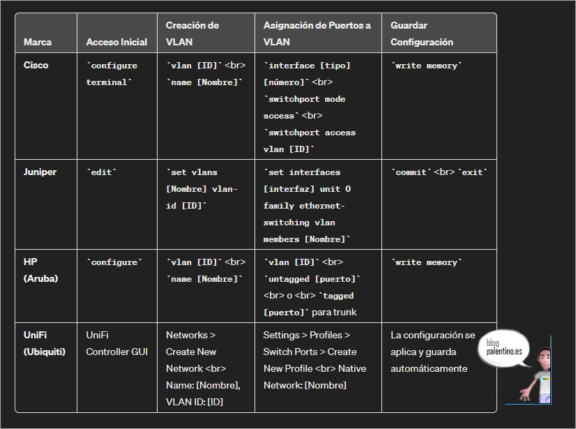 Este cuadro ofrece un punto de partida para la configuración de VLANs en dispositivos de diferentes fabricantes. Es importante tener en cuenta que, dependiendo del modelo específico del dispositivo y de la versión del software o firmware, los comandos exactos y las opciones disponibles pueden variar. Siempre es recomendable consultar la documentación oficial del fabricante para obtener instrucciones detalladas y específicas para tu equipo.